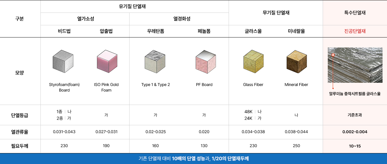비드법단열재, PF보드, 미네랄울, 글라스울, 진공단열재